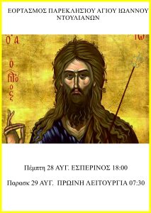 • Πέμπτη 28 Αυγούστου, 18:00: Μέγας Εσπερινός.